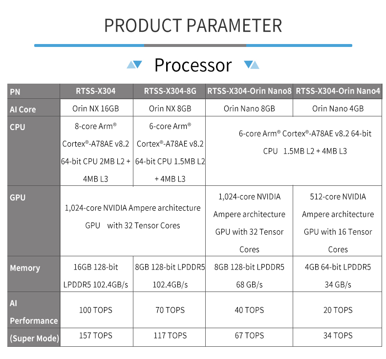 Product description: RTSS-X304 is a new Feiyun Smart box ™ designed specifically for NVIDIA Jetson Orin NX/Orin Nano module. It supports the super mode and features high performance and low power consumption. The Supports the Ubuntu20.04 and Ubuntu22.04 operating systems. It is designed with super strong lightweight aluminum alloy material, with excellent heat dissipation capacity, small and lightweight overall size, excellent ergonomic structure.
