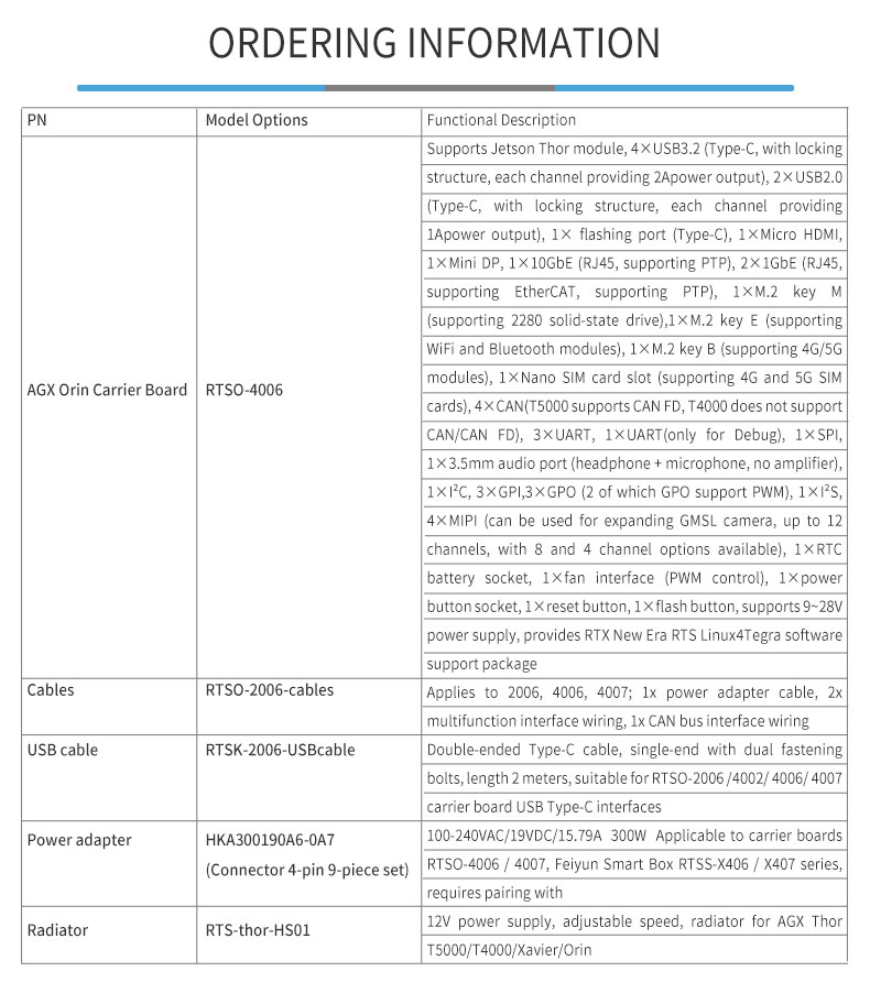 Product description: RTSO-4006 is a high-performance industrial-grade carrier board based on NVIDIA Jetson Thor T5000/T4000, designed for humanoid robots and low-latency embodied intelligent applications. The carrier board features high computing power, real-time performance, scalability, large-capacity storage and reliability, enabling rapid product integration and mass production implementation.