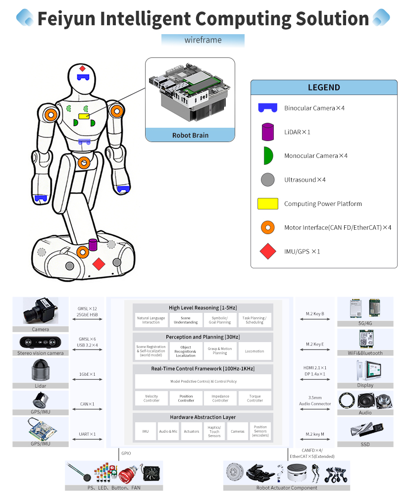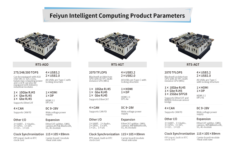 The Jetson embodied intelligent robot brain developed by Realtimes—Feiyun Intelligent Computing RTS-AGO/AGT—offers four computational power levels of 200/275/600/1000 TOPS, featuring the following characteristics.