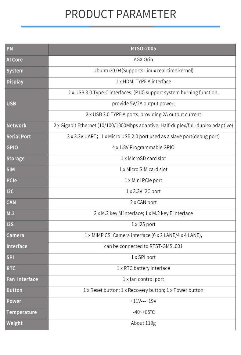Product description: The RTSO-2005 is an industrial-grade carrier board for the NVIDIA Jetson AGX Orin serial modules , meet a variety of demanding conditions. The RTSO-2005 carrier board and module are driven by the Realtimes BSP file to form a power-on and operation-ready board-level system solution.With RTST-GMSL001 camera adapter board, 8-channel GMSL camera video access can be realized.