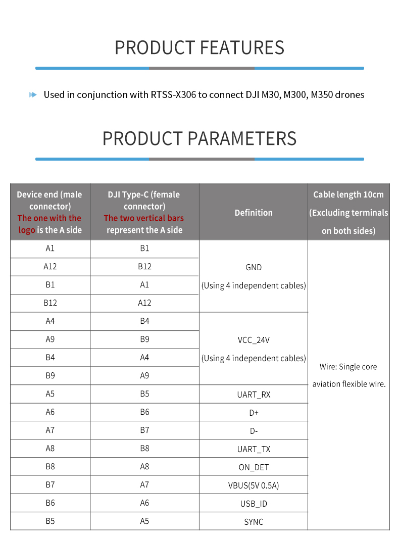 Product description: RTSK-3006-cables03 (OSDK cable) is a dedicated cable that connects the drone flight control to RTSS-X306. It typically includes a UART serial port and a USB to TTL module, used to transmit control commands and sensor data, ensuring stable communication and preventing device damage.