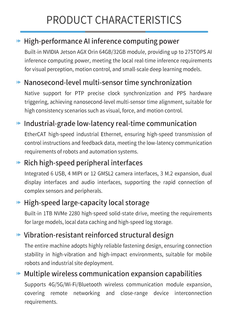 Product description: Feiyun NeuroCub Samrt Box RTSS-X206 is an industrial-grade edge computing platform designed for humanoid robots and low-latency embodied intelligent systems. Based on NVIDIA Jetson AGX Orin with 64GB/32GB memory, it offers a maximum AI inference computing power of 275 TOPS, meeting the typical requirements of embodied intelligent applications such as perception, decision-making, and control. It supports local real-time inference for visual perception, motion control, and small-scale deep learning models.
