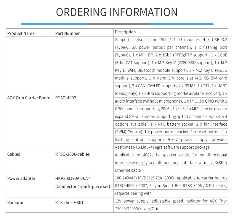 Product description: RTSO-4002 is an industrial-grade carrier board based on NVIDIA Jetson Thor T5000/T4000. It is designed for humanoid robots, drones, and other low-latency embodied intelligent applications. While maintaining high computing power support, the carrier board focuses on enhancing industrial communication, control interfaces, and system expansion capabilities, and is suitable for application scenarios with high requirements for real-time performance and external device connections.