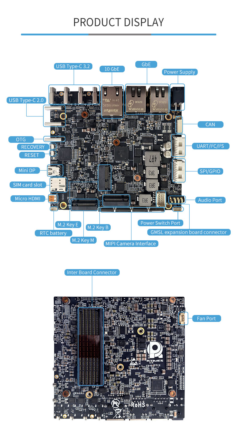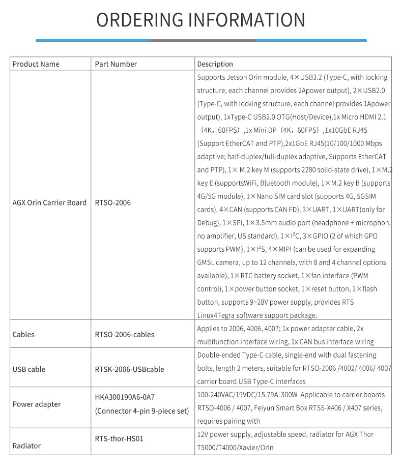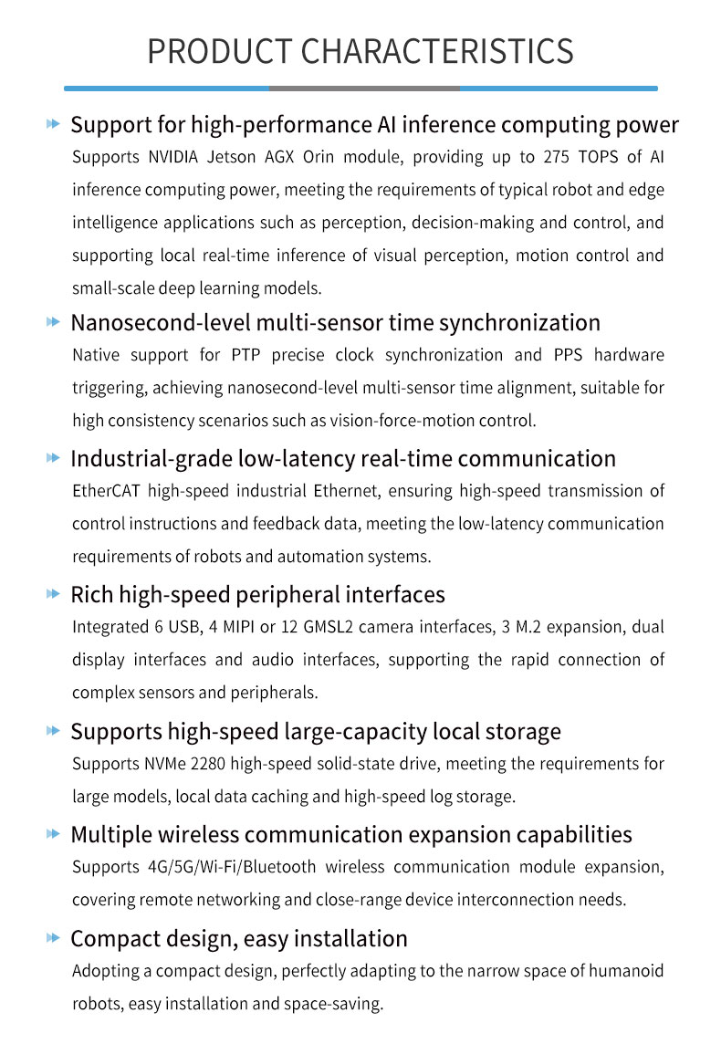 Product description: RTSO-2006 is a high-performance industrial-grade carrier board based on NVIDIA Jetson AGX Orin, designed for humanoid robots and low-latency embodied intelligent applications. The carrier board features high computing power, real-time performance, scalability, large-capacity storage and reliability, enabling rapid product integration and mass production implementation.