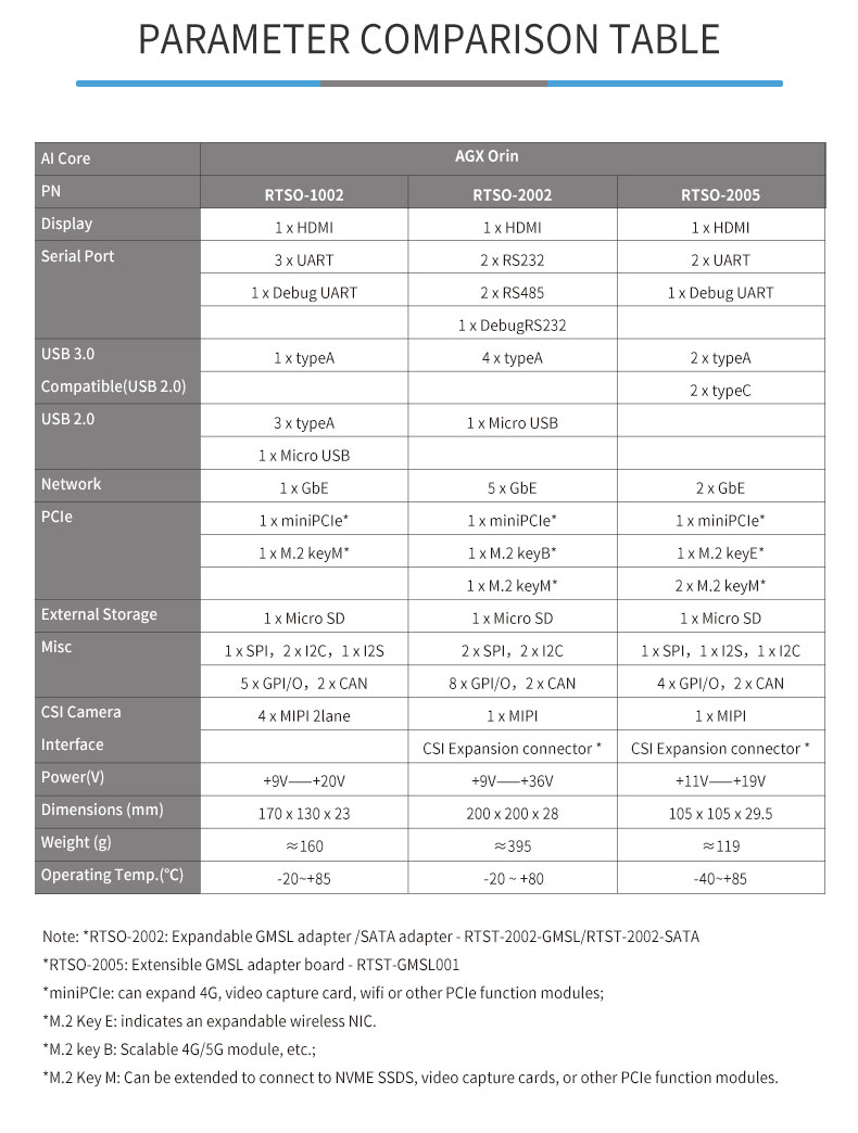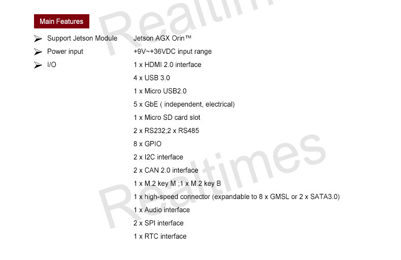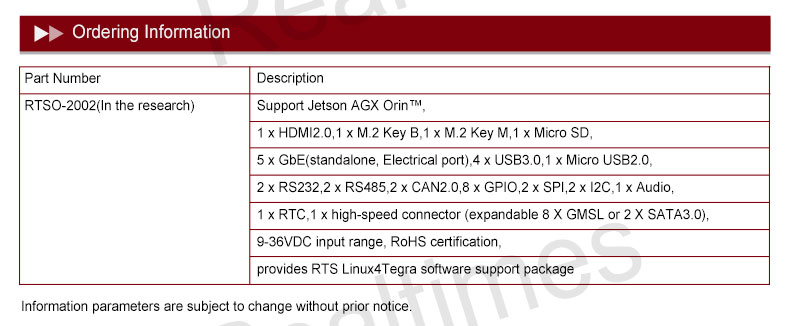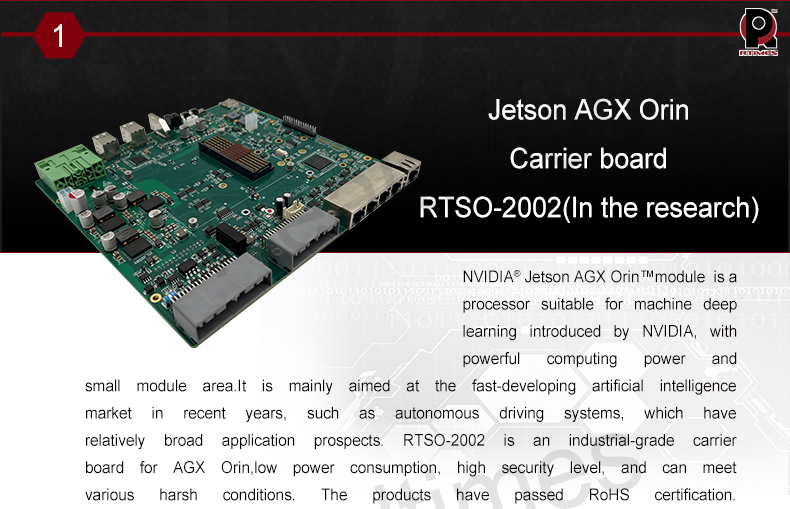 Product description: The RTSO-2002 is an industrial-grade carrier board for AGX Orin, can meet a variety of demanding conditions. The RTSO-2002 carrier board and module are driven by the Realtimes BSP file to form a power-on and operation-ready board-level system solution. It can be used with RTST-2002-GMSL to achieve 8-channel GMSL camera access or RTST-2002-SATA adapter board to achieve 2-channel SATA access;