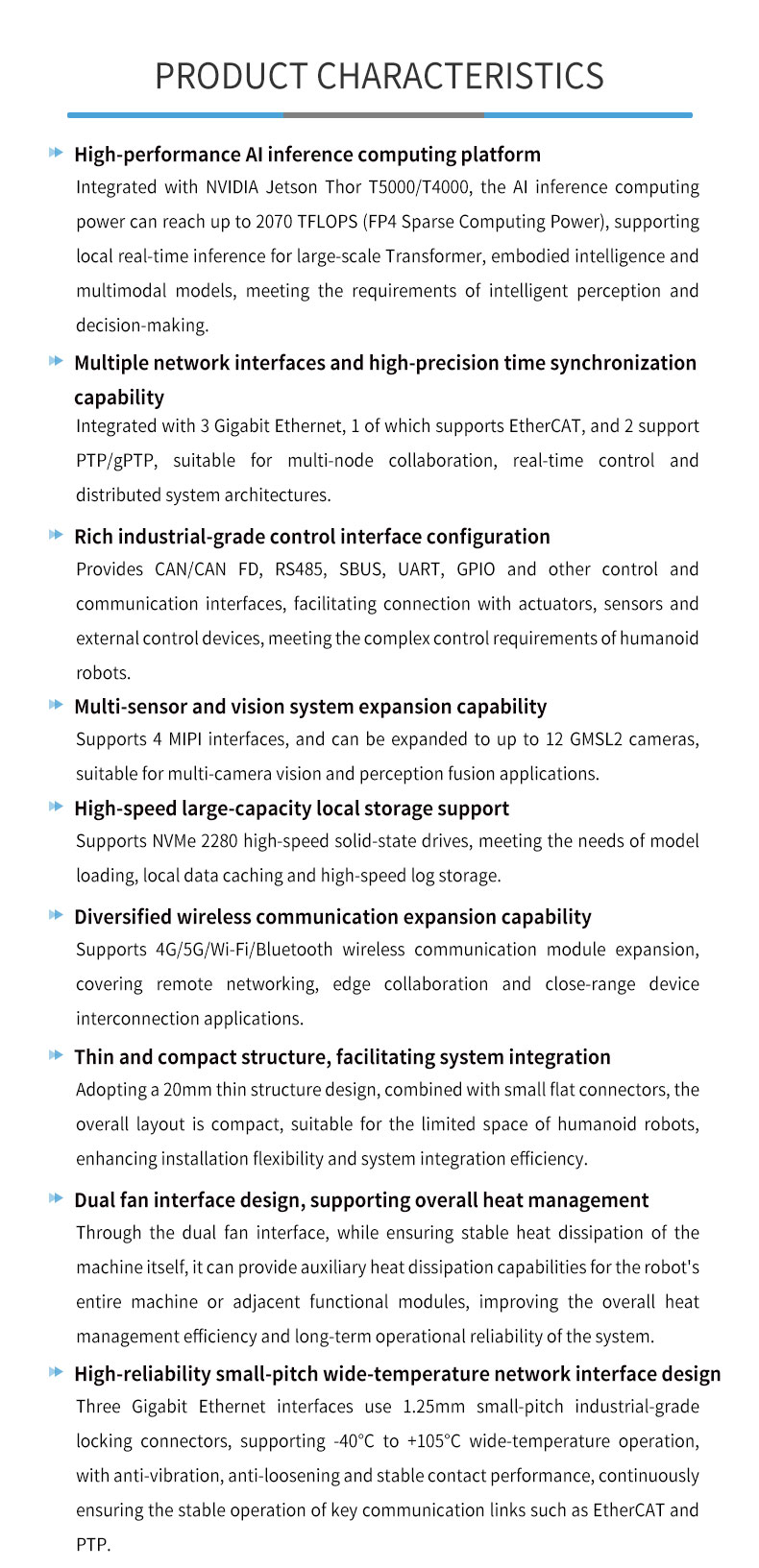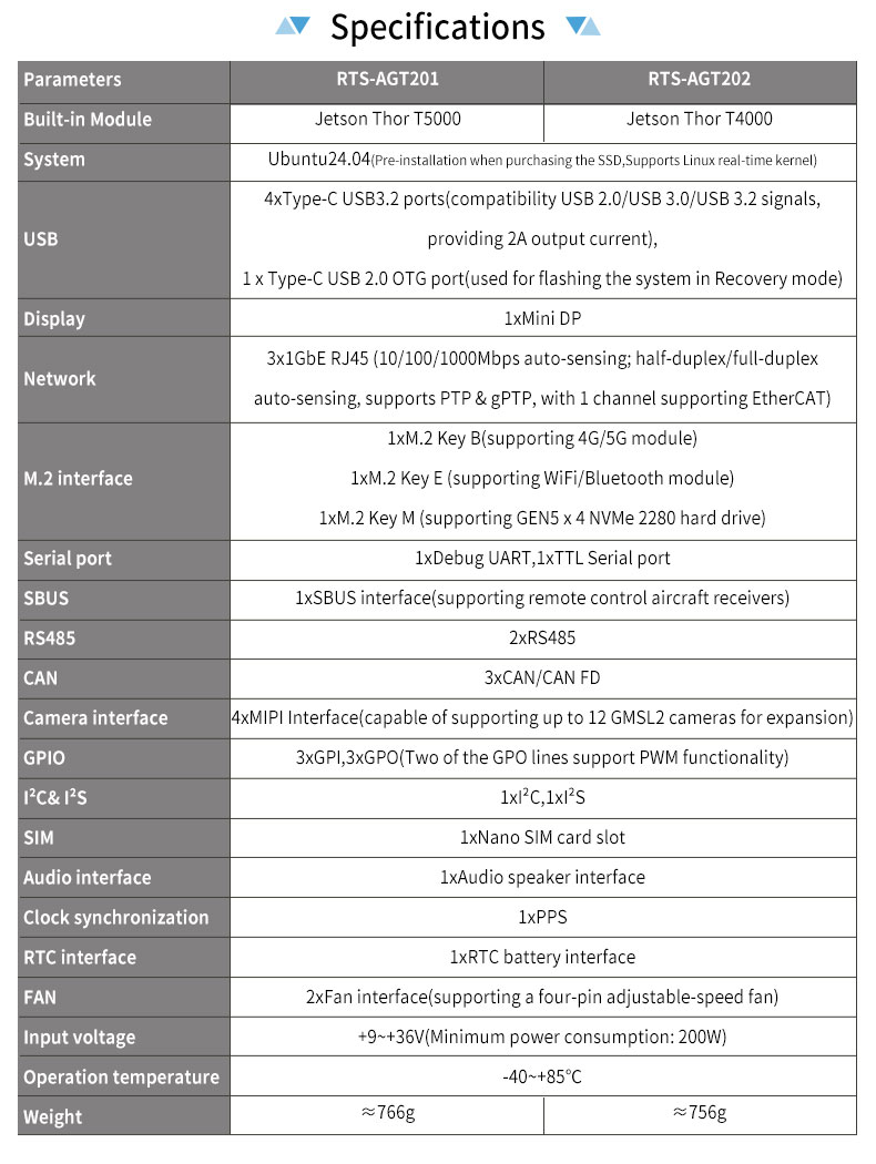 Product description: Feiyun NeuroCub Platform RTS-AGT200 is a self-developed integrated computing platform by Realtimes, specifically designed for humanoid robots and low-latency embodied intelligent robots. It is built based on the NVIDIA Jetson Thor T5000/T4000 platform, integrating industrial-grade carrier boards, computing modules and cooling systems. With a thin and compact design, it can flexibly adapt to integrated environments with limited space, such as humanoid robots.