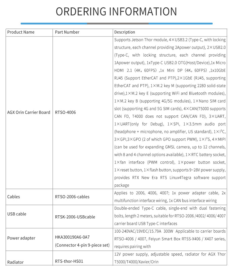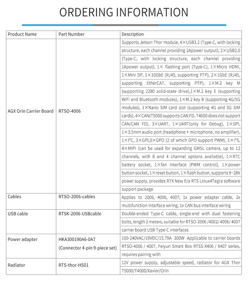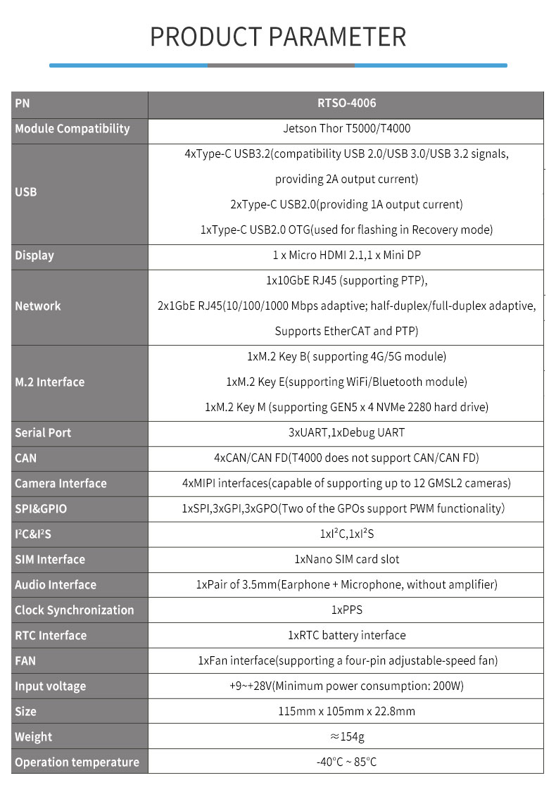 Product description: RTSO-4006 is a high-performance industrial-grade carrier board based on NVIDIA Jetson Thor T5000/T4000, designed for humanoid robots and low-latency embodied intelligent applications. The carrier board features high computing power, real-time performance, scalability, large-capacity storage and reliability, enabling rapid product integration and mass production implementation.