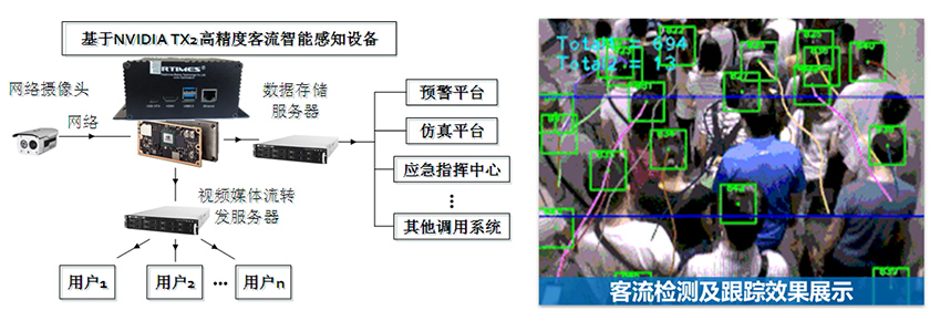 采用了NVIDIA Jetson TX2 Module深度学习平台,使得检测到的行人数据准确度、运算时间、效率等得到大幅提升,得到客流计算精准度大于等于96%;客流密度检测精度大于等于95%;客流平均速度检测精度大于等92%;行人跟踪轨迹准确率大于等于95%。
