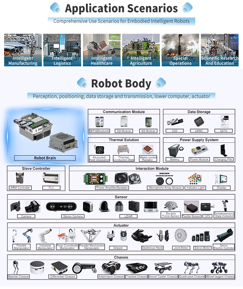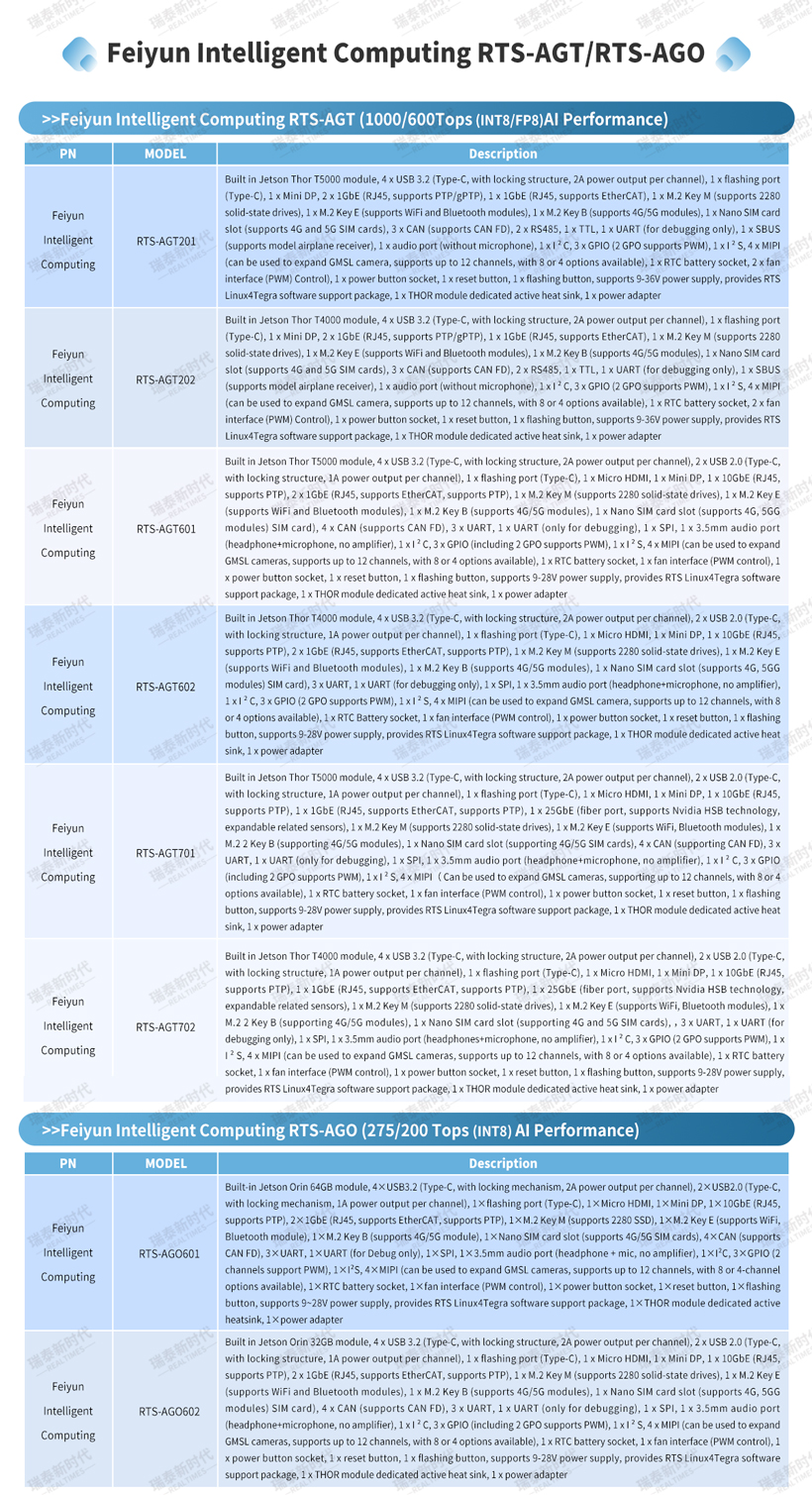 The Jetson embodied intelligent robot brain developed by Realtimes—Feiyun Intelligent Computing RTS-AGO/AGT—offers four computational power levels of 200/275/600/1000 TOPS, featuring the following characteristics.