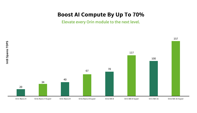 With NVIDIA's major release of JetPack 6.2, the powerful "Super Mode" is now unlocked for Jetson Orin Nano and Jetson Orin NX modules! In this mode, the AI performance (TOPS) of the Jetson Orin NX series surges by up to 70%, while the Jetson Orin Nano series also sees a remarkable boost. Memory bandwidth increases by 50%, and generative AI inference performance doubles — unleashing next-level capabilities!