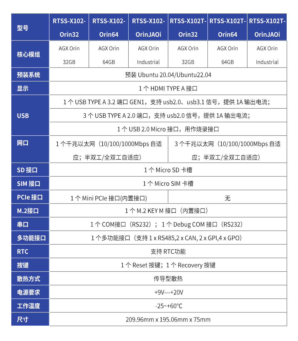 The RTSS-X102 is an intelligent computing device purpose-built for the NVIDIA Jetson AGX Orin platform. It is widely adopted in scenarios that demand high-performance computing and advanced AI inference. Designed to meet the rigorous requirements of edge computing, artificial intelligence, and embedded applications, the RTSS-X102 delivers powerful edge AI capabilities across a wide range of industries. The key features are listed below: