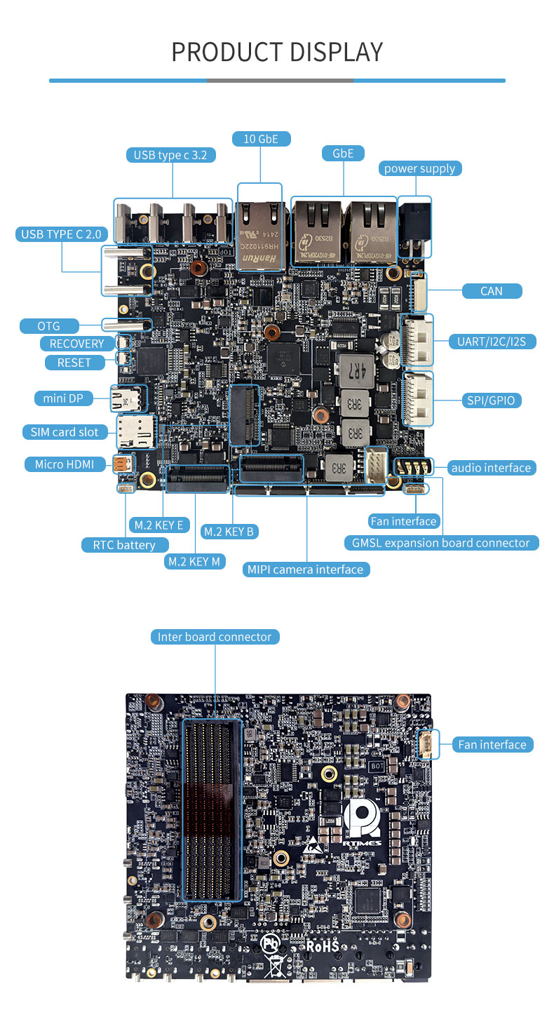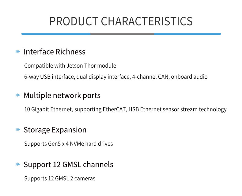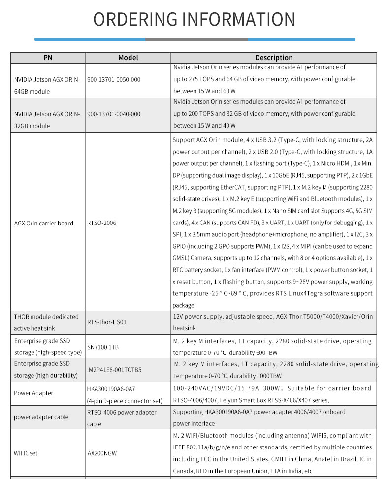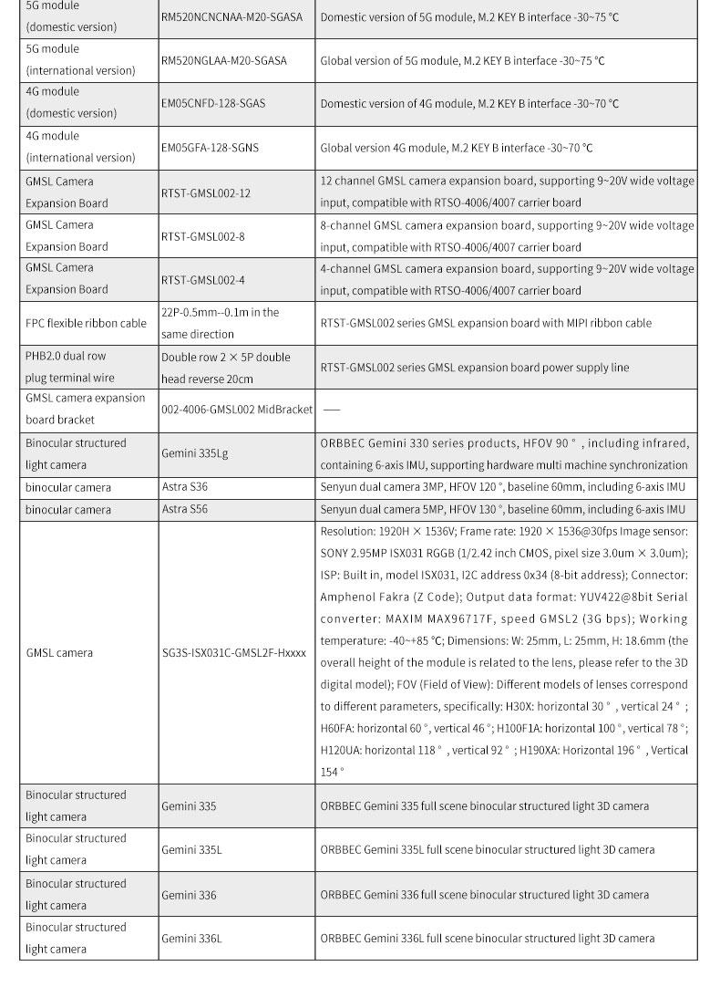 Product description: The RTSO-4006 is an industrial-grade carrier board designed for the NVIDIA Jetson AGX Orin module. It integrates a wealth of interfaces, including 6 USB ports, 10 Gigabit Ethernet, 4 CAN/CAN FD channels, and 12 GMSL camera supports, along with support for Gen5 NVMe drives. Featuring a compact design, it supports wide voltage input (9-28V) and operates within a broad temperature range of -40°C to 85°C, ensuring industrial-grade reliability and durability.