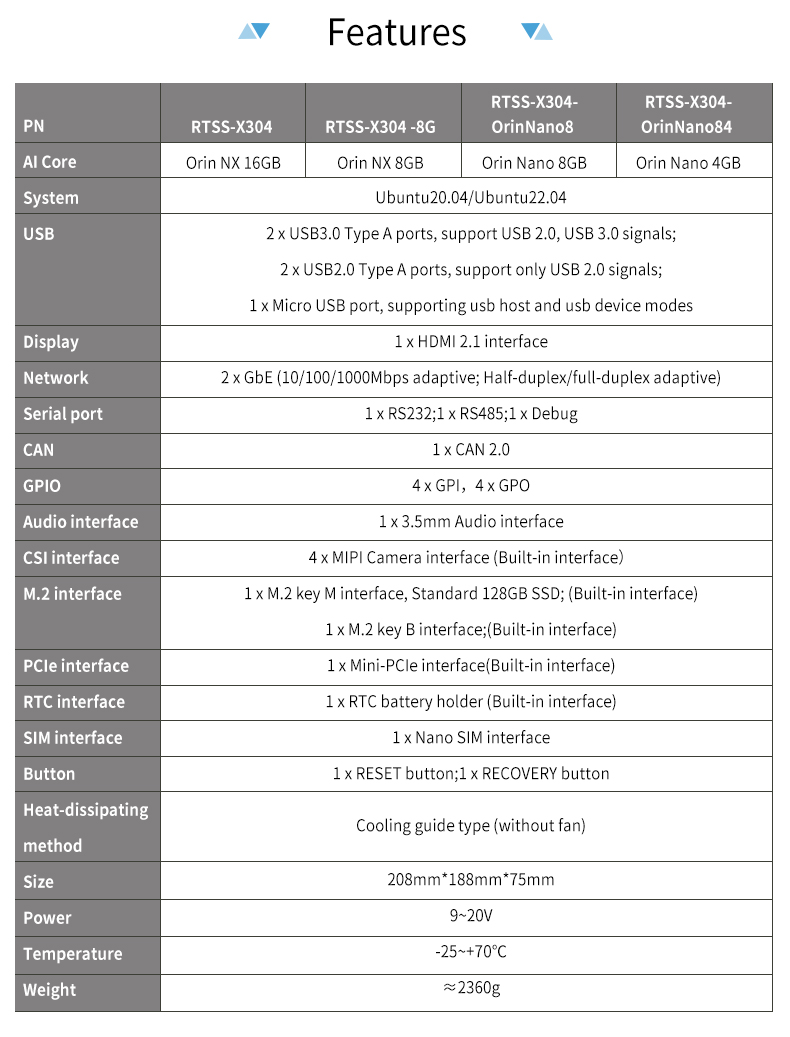 Product description: RTSS-X304 is a new Feiyun Smart box ™ designed specifically for NVIDIA Jetson Orin NX/Orin Nano module. It supports the super mode and features high performance and low power consumption. The Supports the Ubuntu20.04 and Ubuntu22.04 operating systems. It is designed with super strong lightweight aluminum alloy material, with excellent heat dissipation capacity, small and lightweight overall size, excellent ergonomic structure.