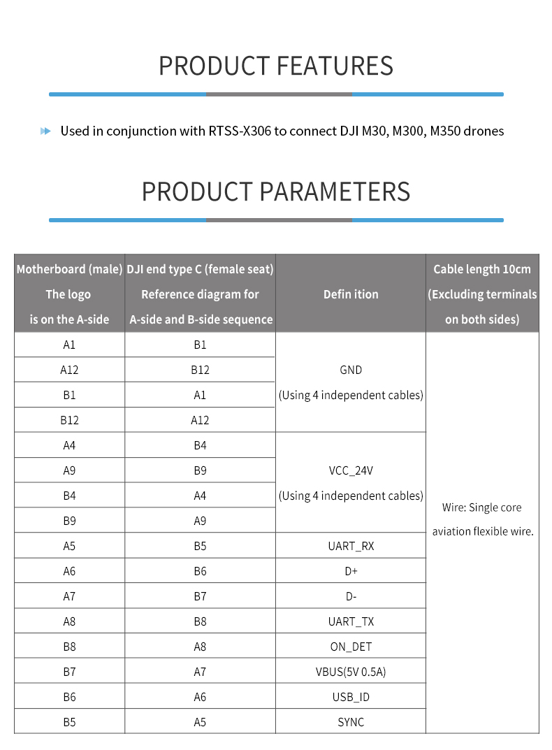 Product description: RTSK-3006-cables03 (OSDK cable) is a dedicated cable that connects the drone flight control to RTSS-X306. It typically includes a UART serial port and a USB to TTL module, used to transmit control commands and sensor data, ensuring stable communication and preventing device damage.