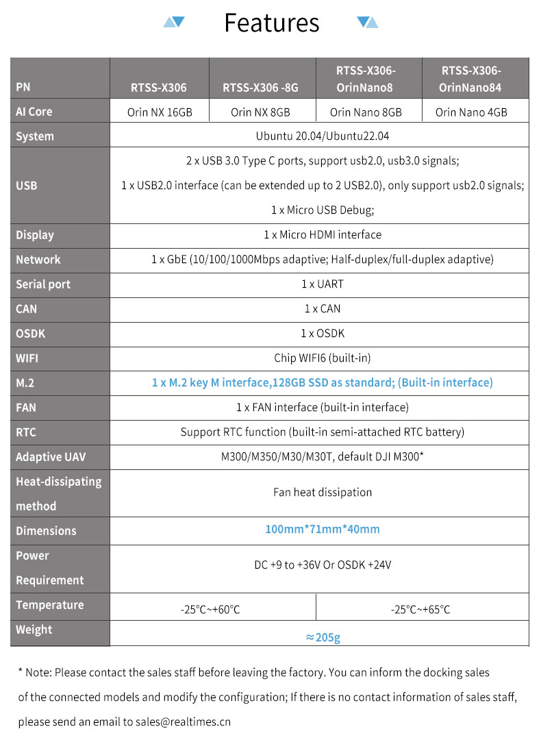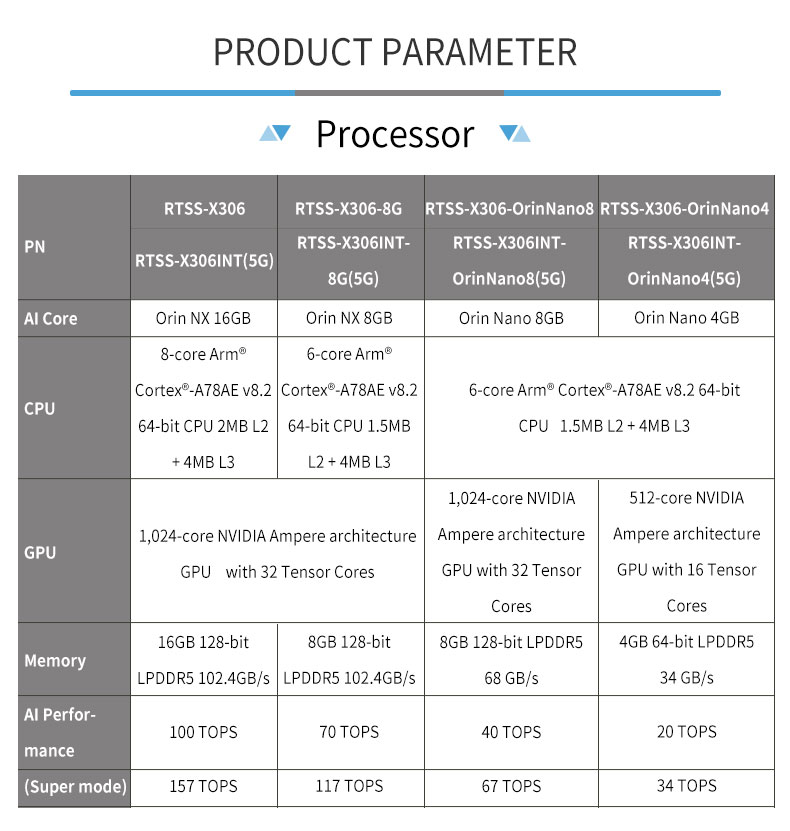 • Product description: RTSS-X306 is a new Feiyun Smart box ™ designed specifically for NVIDIA Jetson Orin NX/Orin Nano module. It supports the super mode and features high performance and low power consumption. The Supports the Ubuntu20.04 and Ubuntu22.04 operating systems. It is designed with super strong lightweight aluminum alloy material, with excellent heat dissipation capacity, small and lightweight overall size, excellent ergonomic structure.