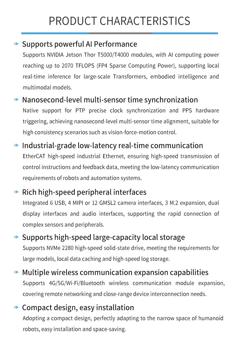 Product description: RTSO-4006 is a high-performance industrial-grade carrier board based on NVIDIA Jetson Thor T5000/T4000, designed for humanoid robots and low-latency embodied intelligent applications. The carrier board features high computing power, real-time performance, scalability, large-capacity storage and reliability, enabling rapid product integration and mass production implementation.