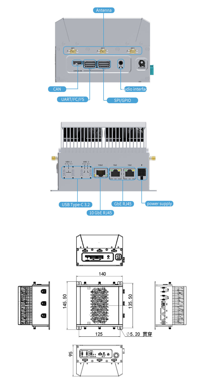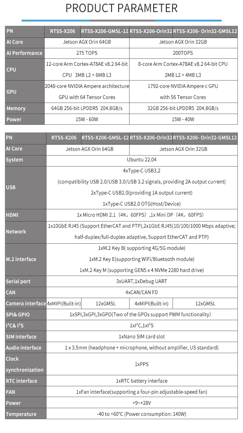 Product description: Feiyun NeuroCub Samrt Box RTSS-X206 is an industrial-grade edge computing platform designed for humanoid robots and low-latency embodied intelligent systems. Based on NVIDIA Jetson AGX Orin with 64GB/32GB memory, it offers a maximum AI inference computing power of 275 TOPS, meeting the typical requirements of embodied intelligent applications such as perception, decision-making, and control. It supports local real-time inference for visual perception, motion control, and small-scale deep learning models.