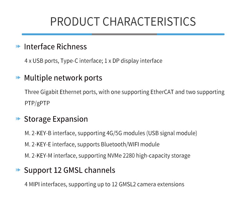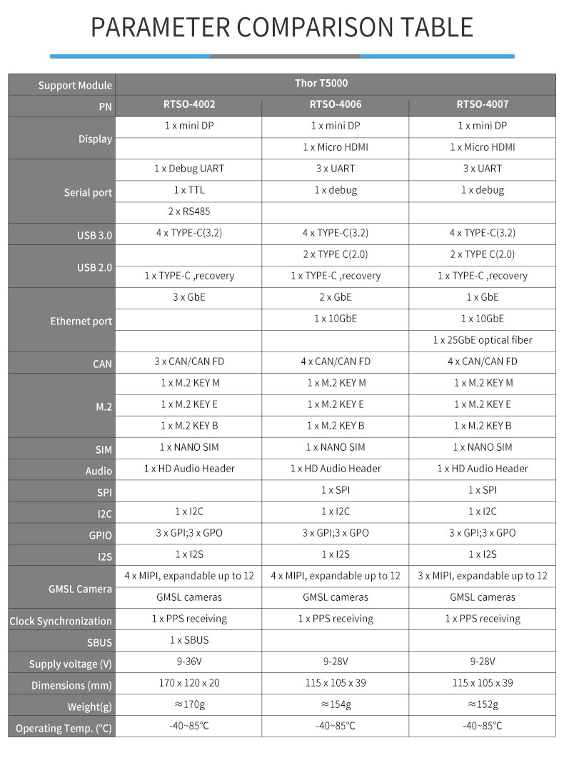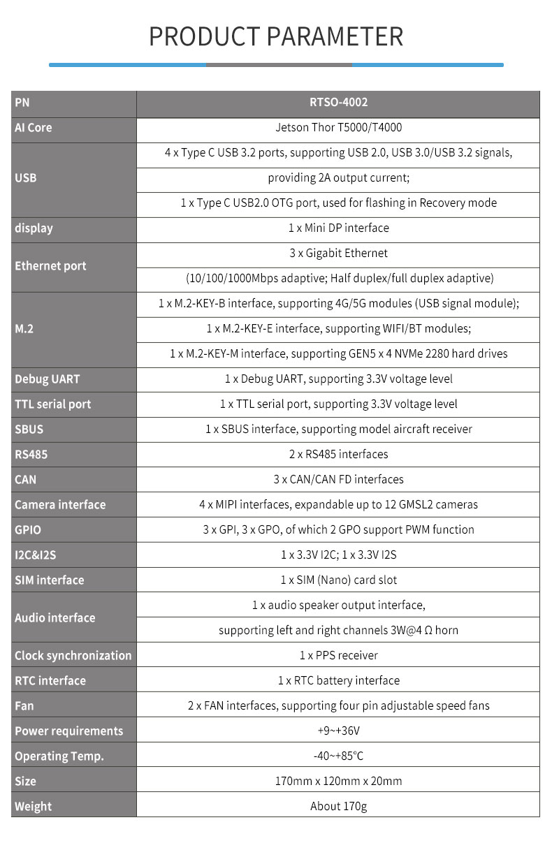 Product description: RTSO-4002 is an industrial grade carrier board designed for NVIDIA Jetson Thor modules. The product integrates rich interfaces such as 4-channel USB, 3-channel Gigabit Ethernet, 3-channel CAN/CANFD, and 12 channel GMSL camera support, and supports Gen5 NVMe hard drives. It adopts a compact design, supports wide voltage power supply (9-28V), and has a wide temperature working ability from -40 ℃ to 85 ℃, ensuring industrial grade reliability and durability.