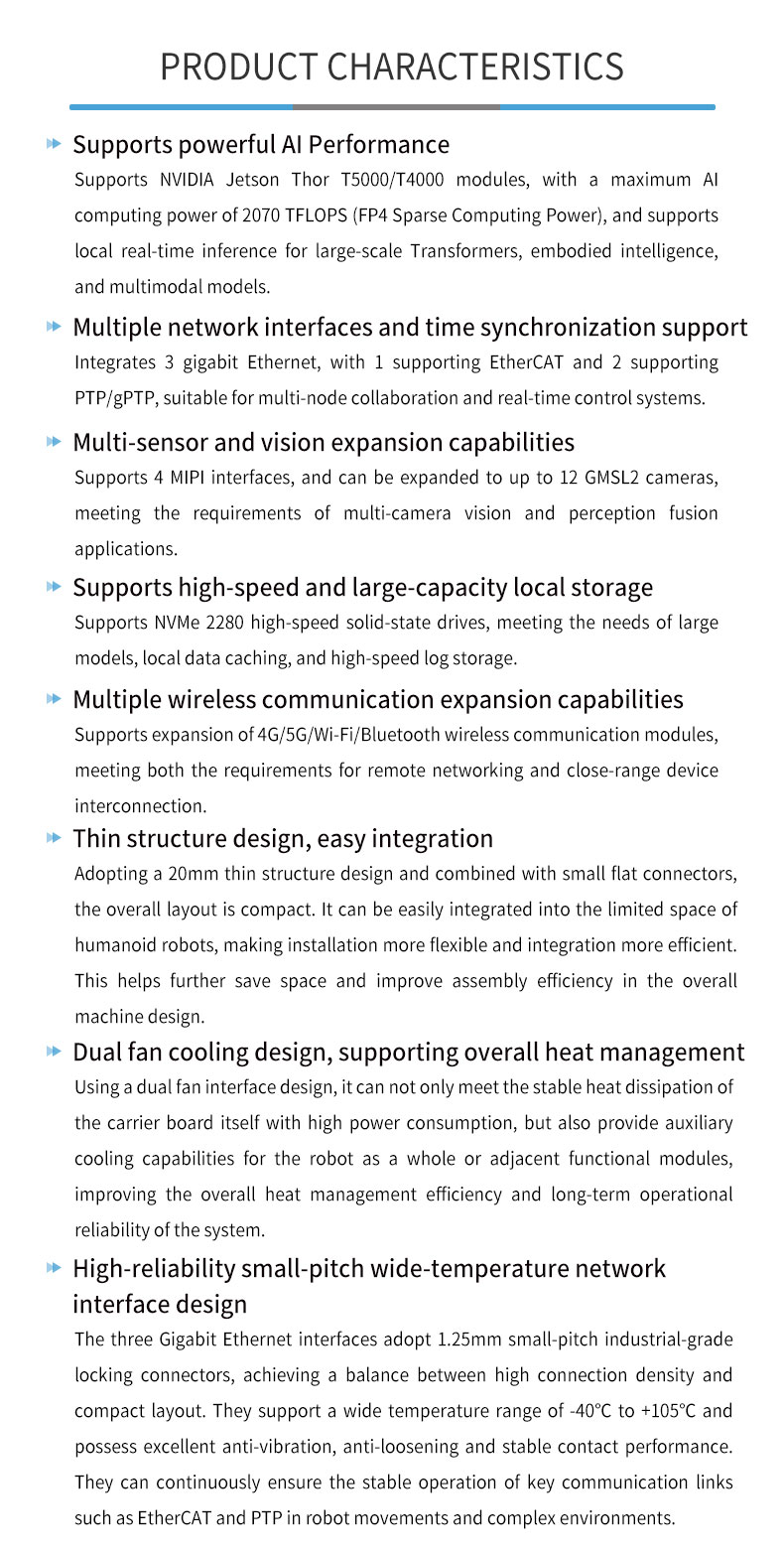 Product description: RTSO-4002 is an industrial-grade carrier board based on NVIDIA Jetson Thor T5000/T4000. It is designed for humanoid robots, drones, and other low-latency embodied intelligent applications. While maintaining high computing power support, the carrier board focuses on enhancing industrial communication, control interfaces, and system expansion capabilities, and is suitable for application scenarios with high requirements for real-time performance and external device connections.
