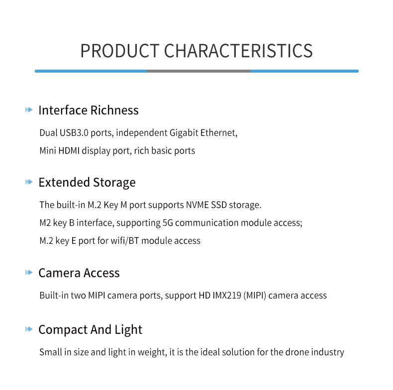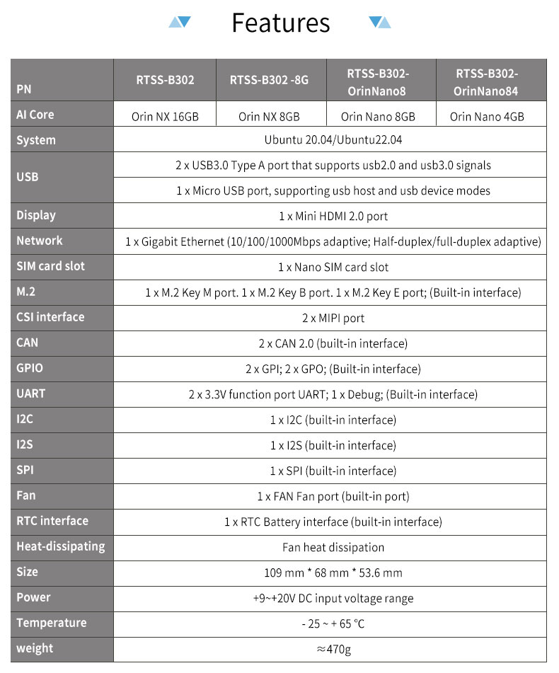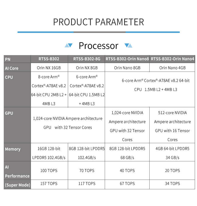 Product description: RTSS-B302 is a new Feiyun Smart box ™ designed specifically for NVIDIA Jetson Orin NX/Orin Nano module. It supports the super mode and features high performance and low power consumption. The Supports the Ubuntu20.04 and Ubuntu22.04 operating systems. It is designed with super strong lightweight aluminum alloy material, with excellent heat dissipation capacity, small and lightweight overall size, excellent ergonomic structure.