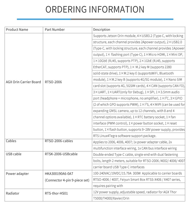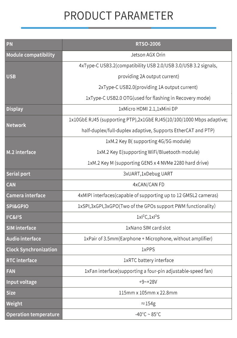 Product description: RTSO-2006 is a high-performance industrial-grade carrier board based on NVIDIA Jetson AGX Orin, designed for humanoid robots and low-latency embodied intelligent applications. The carrier board features high computing power, real-time performance, scalability, large-capacity storage and reliability, enabling rapid product integration and mass production implementation.