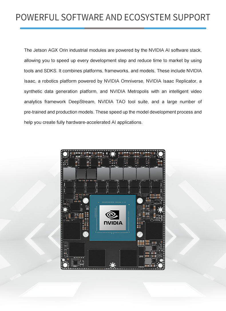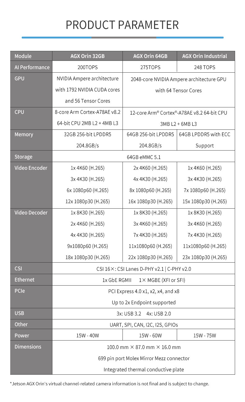 Product description: The Jetson AGX Orin module can provide up to 275 TOPS of AI performance, with power configurable between 15 watts and 60 watts. The external specifications of this module are the same as those of Jetson AGX Xavier, but its performance can be more than 8 times that of the latter. The Jetson AGX Orin comes in three versions: 64GB, 32GB, and industrial.