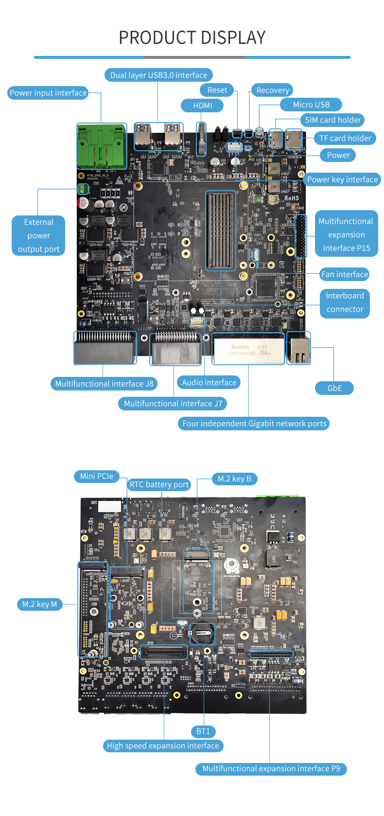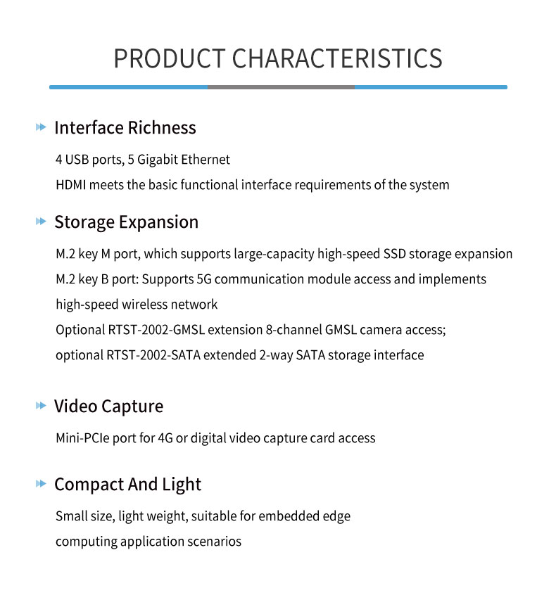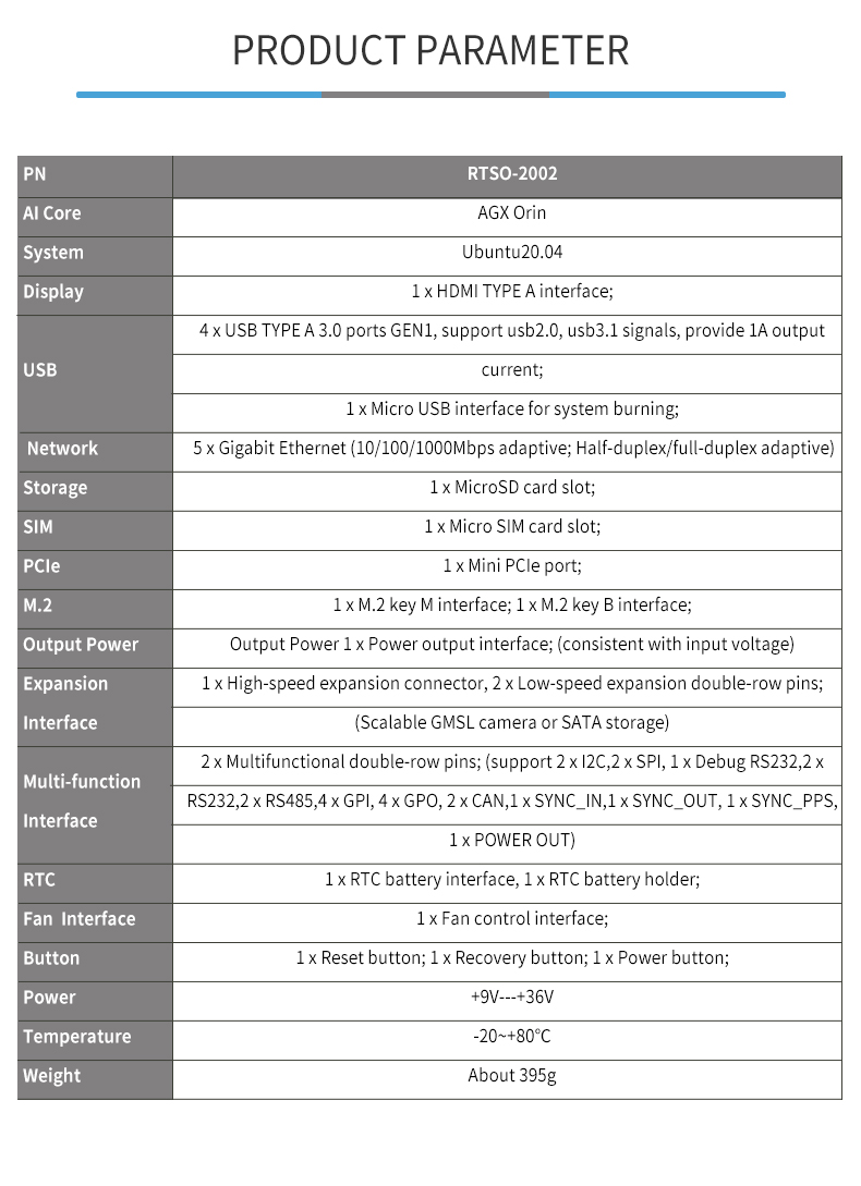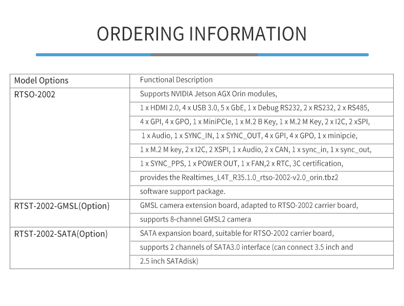 Product description: The RTSO-2002 is an industrial-grade carrier board for AGX Orin, can meet a variety of demanding conditions. The RTSO-2002 carrier board and module are driven by the Realtimes BSP file to form a power-on and operation-ready board-level system solution. It can be used with RTST-2002-GMSL to achieve 8-channel GMSL camera access or RTST-2002-SATA adapter board to achieve 2-channel SATA access;