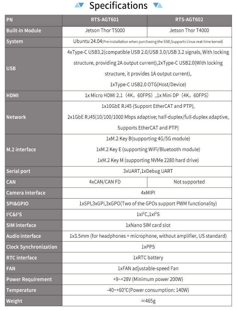 • Product description: Feiyun NeuroCub Platform RTS-AGT600 is a self-developed computing platform by Realtimes for humanoid robots and low-latency embodied intelligent robots. It is built based on the NVIDIA Jetson Thor T5000/T4000 platform, integrating high-performance carrier boards, computing modules and industrial-grade cooling systems, and is designed for humanoid robots and low-latency embodied intelligent application scenarios.