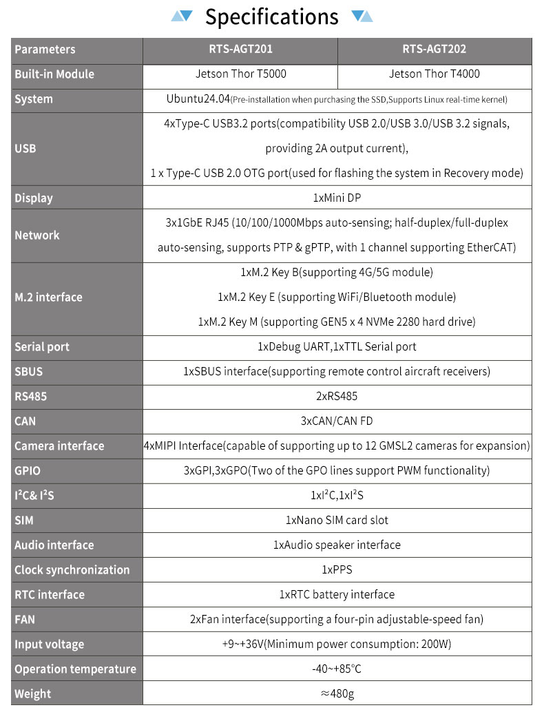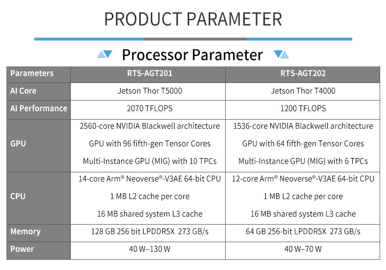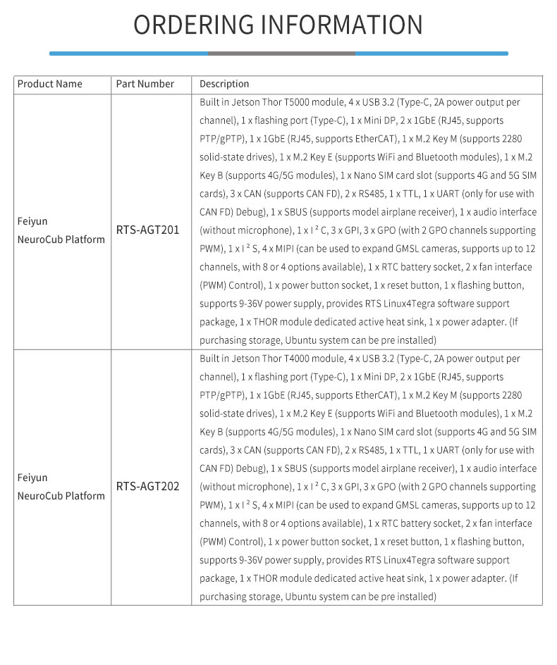 Product description: Feiyun NeuroCub Platform RTS-AGT200 is a self-developed integrated computing platform by Realtimes, specifically designed for humanoid robots and low-latency embodied intelligent robots. It is built based on the NVIDIA Jetson Thor T5000/T4000 platform, integrating industrial-grade carrier boards, computing modules and cooling systems. With a thin and compact design, it can flexibly adapt to integrated environments with limited space, such as humanoid robots.