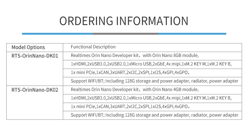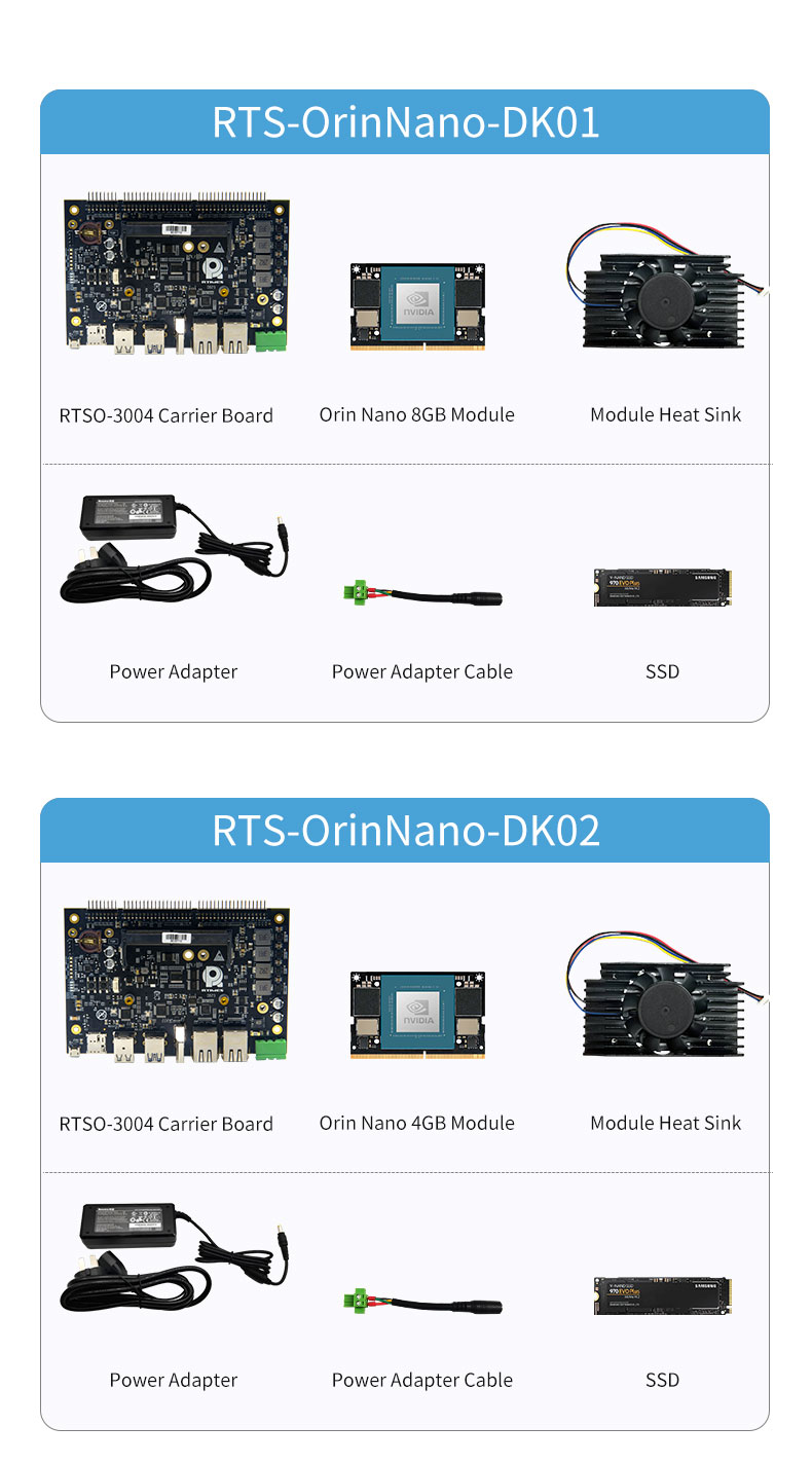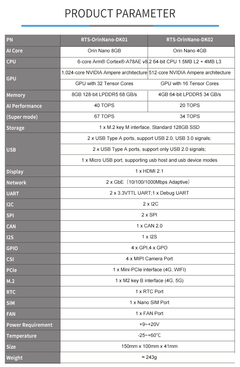 Product description: The Realtimes Orin Nano development kit can be adapted to Orin Nano 8GB and Orin Nano 4GB core modules. The Realtimes Orin Nano development kit provides a wealth of data interfaces to fully elicit Orin Nano module resources. Support super mode.The rich variety of interfaces meets customers' diverse sensor access needs. Provide fast and efficient active heat dissipation design, can adapt to more complex use environment, standard 128GB SSD storage, to ensure high-speed and stable data reading and writing, It can meet the rich scene applications of robotics, industry, transportation, medical treatment, scientific research and so on.