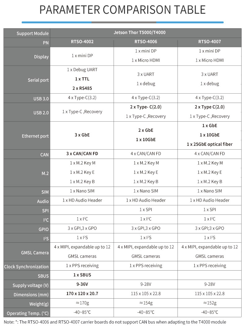 Product description: RTSO-4006 is a high-performance industrial-grade carrier board based on NVIDIA Jetson Thor T5000/T4000, designed for humanoid robots and low-latency embodied intelligent applications. The carrier board features high computing power, real-time performance, scalability, large-capacity storage and reliability, enabling rapid product integration and mass production implementation.